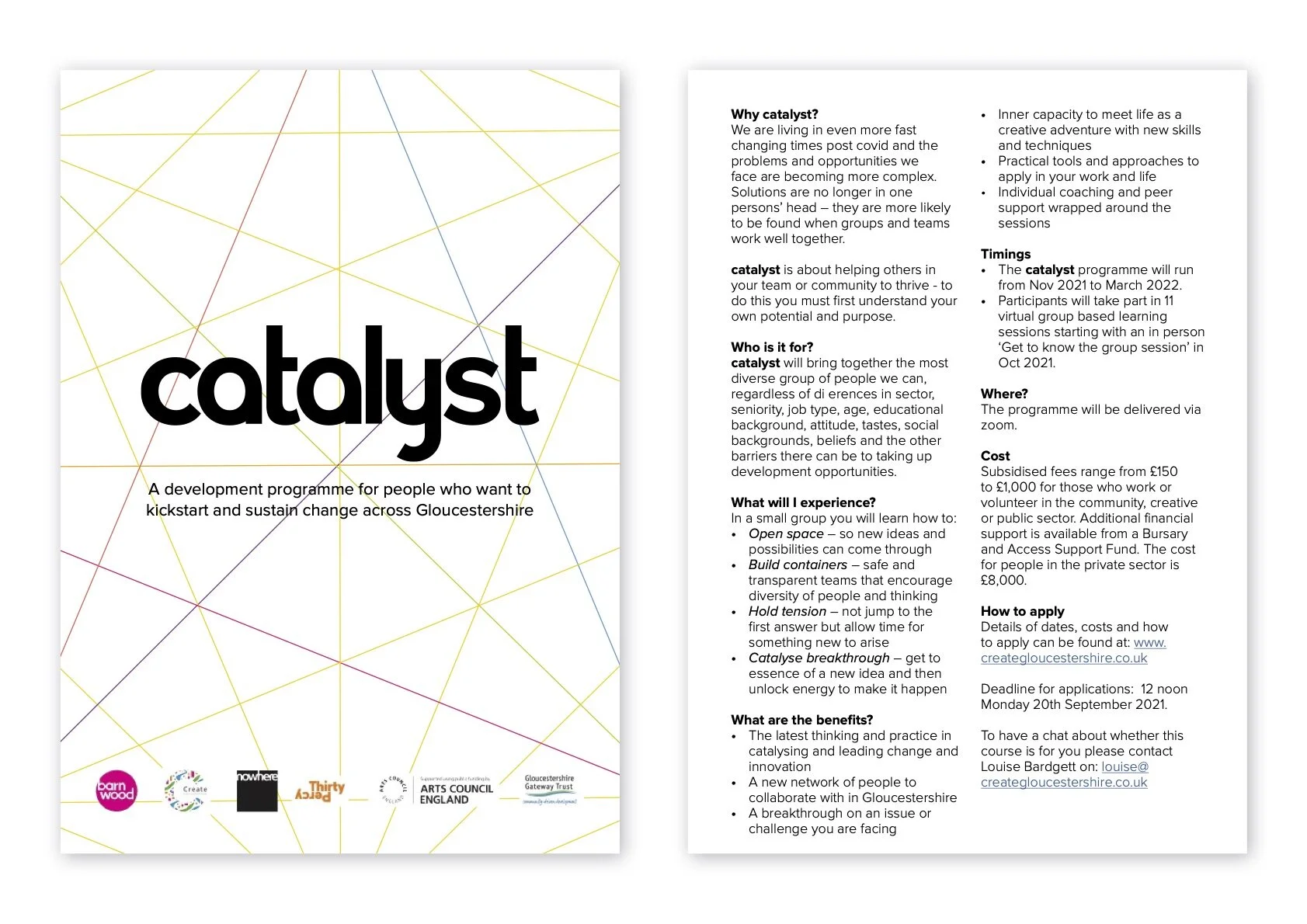 We have teamed up with nowhere to design catalyst. The programme is based upon best practice from the commercial and not for profit sectors and our partnership combines the expertise of nowhere in developing the skills and mindsets of creative and collaborative organisations with CG’s skills and networks in place- based development across Gloucestershire.