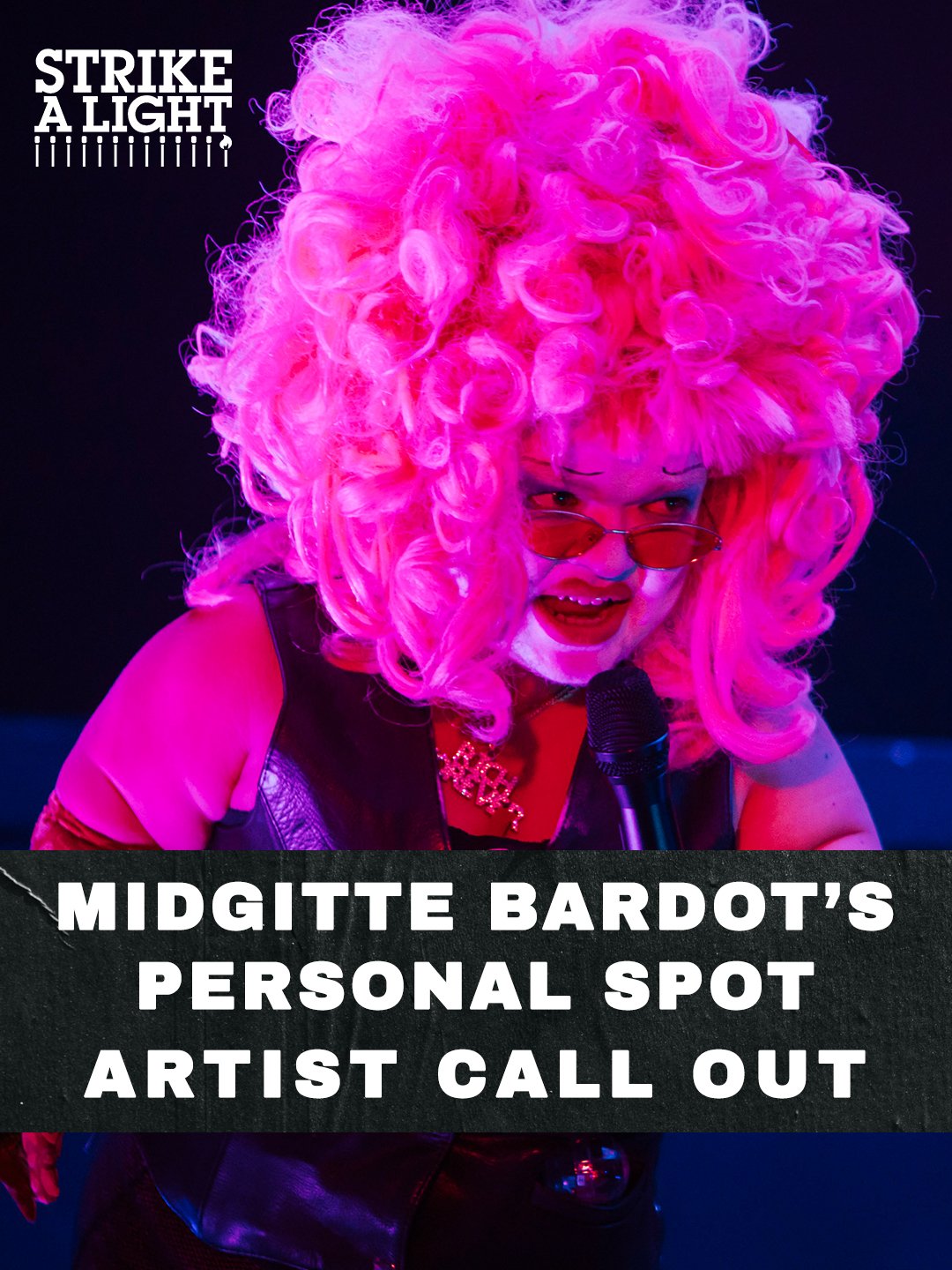 Alt Image Text: Midgitte Bardot performing on stage holding a microphone, wearing a huge bright pink wig, small red sunglasses, a blingy necklace, and a leather dress. Bold white text reads: Midgitte Bardot’s Personal Spot, Artist Call Out.
